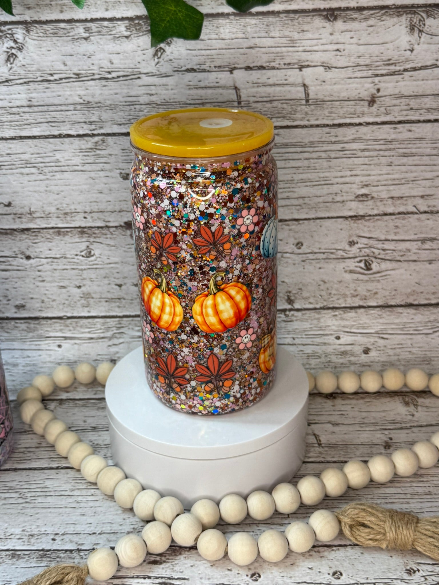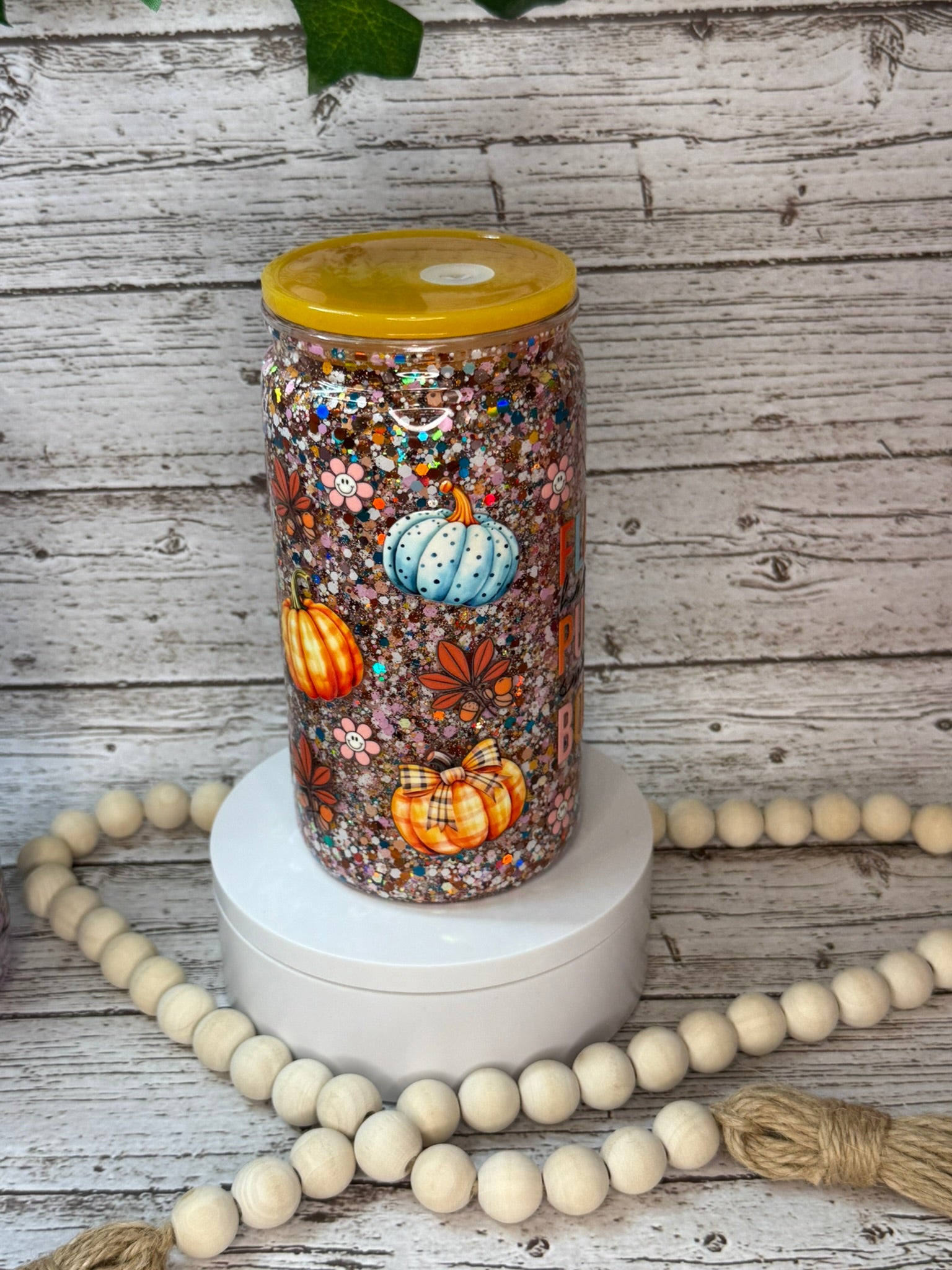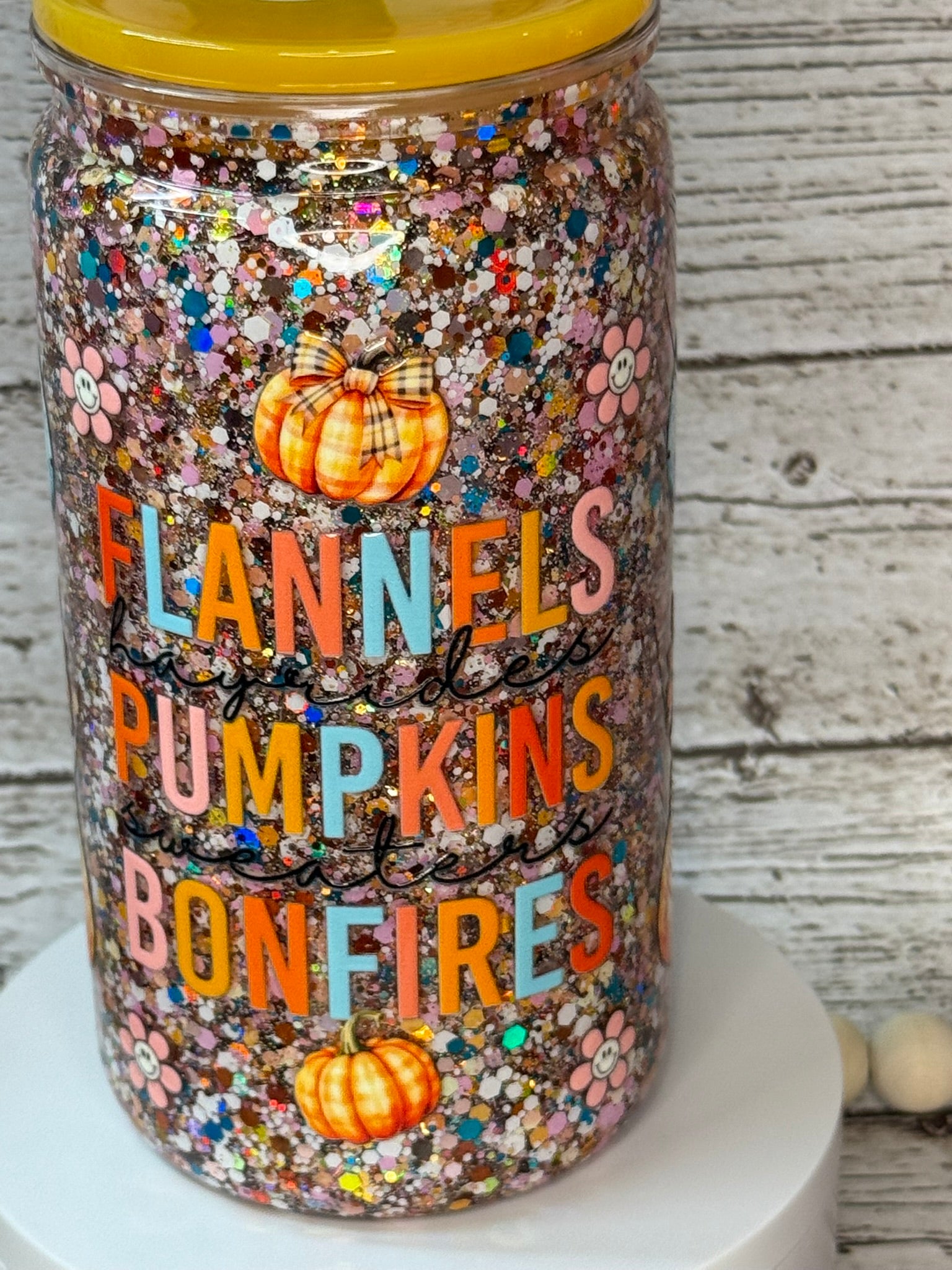 Wrap yourself in autumn with this dreamy double-wall glitter cup! Featuring the ultimate fall checklist, "flannels, hayrides, pumpkins, sweaters, and bonfires", this cup sparkles with cozy vibes in every sip. It’s filled with a blend of warm, autumn-colored glitter and topped with a gorgeous yellow-orange lid that brings pumpkin patch perfection.