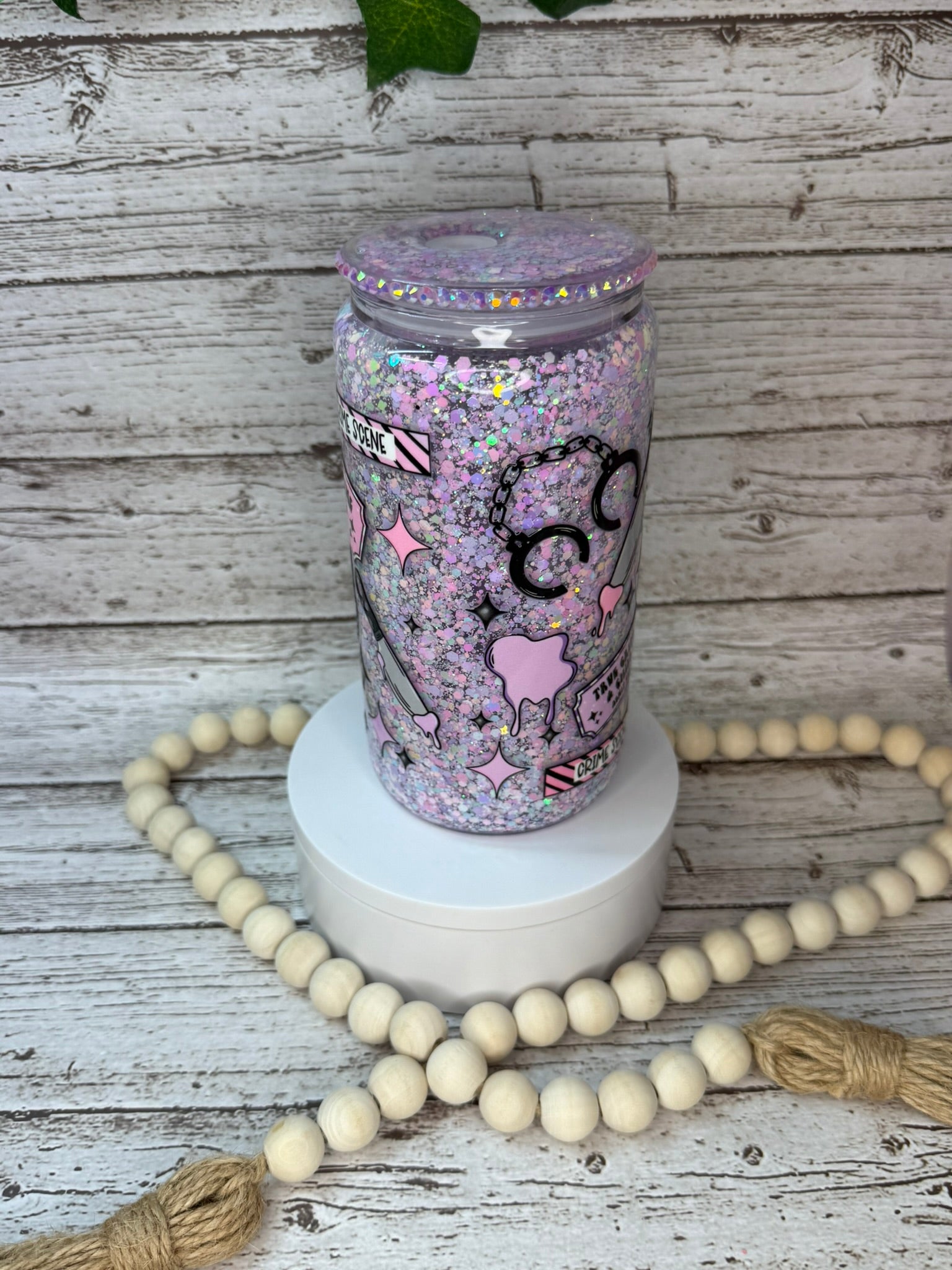 For the glam girl who can spot a red flag faster than a detective at a crime scene, this one’s made for you. Featuring a “True Crime Movie Club” design, this double-wall snow globe tumbler is filled with a killer combo of pink, purple, and ultra-sparkly glitter that swirls like drama in a docu-series.