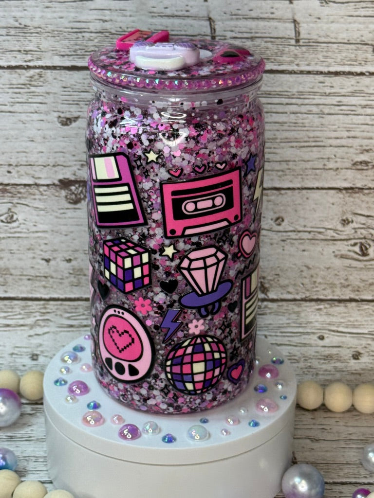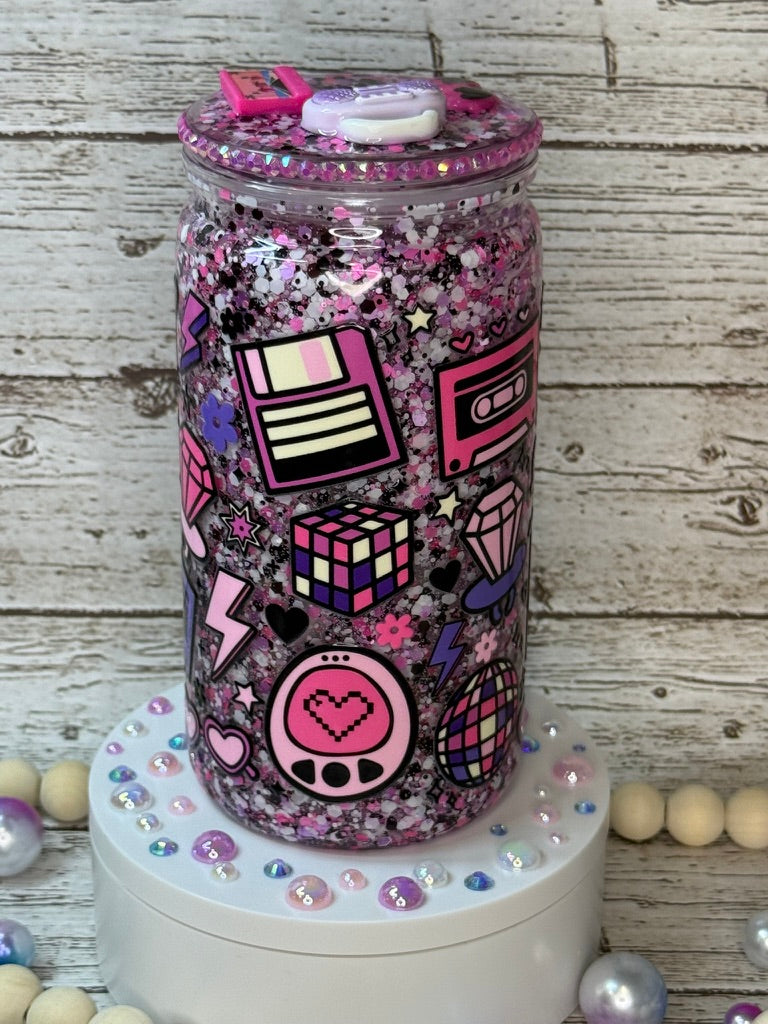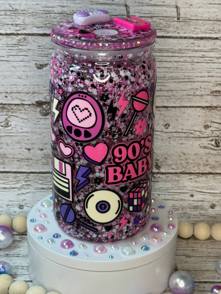 Throw it back in style with this bold and nostalgic 90’s Baby cup! Covered in vibrant floating glitter and decked out with retro icons, cassette tapes, Rubik’s cubes, lollipops, hearts, and more, this cup is a total vibe for anyone who grew up in the best decade.