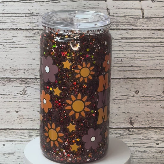 Show off your mama pride with a little sparkle! This BPA-free double-wall snow globe cup is packed with bold, chunky glitter that brings out the colors of the design beautifully. The retro “MAMA” design paired with flowers, suns, and stars gives it a groovy, feel-good vibe that’s as fun as it is stylish.